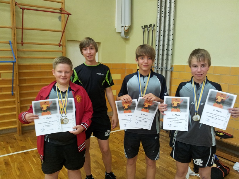 Am Nachmittag fand dann das Turnier der A-Schüler statt. Dort zählten Markus Zilinsky, Ludwig Masula und Benjamin Hoffmann zu den Favoriten auf den Titel. Mit Eskil Pangratz und Bastian Rinnert wollten sich aber noch zwei Spieler der TTF für die Bezirksmeisterschaften qualifizieren. Für Bastian kam allerdings leider in der Gruppenphase das aus. Ludwig, Benni und Markus konnten ihre Gruppen souverän gewinnen und auch Eskil qualifizierte sich als Gruppenzweiter für die Endrunde. Im Viertelfinale kam es zum vereinsinternen Duell zwischen Pangratz und Hoffmann, wobei sich Benni mit 3:0 durchsetzen konnte. Auch in den anderen Duellen mit TTF Beteiligung gab es klare Siege und so sicherten sich die TTF 3 von 4 Plätzen im Halbfinale. Dort kam es zu den Duellen Hoffmann gegen Masula und Markus musste sich mit Frommelt (Post Görlitz) auseinander setzen. Für Markus war leider im Halbfinale Endstation und er belegte am Ende gemeinsam mit Ludwig den dritten Platz. Ludwig unterlag in einem guten Spiel knapp gegen Benni, der ohne Satzverlust ins Finale einzog. Dort behielt er seine weise Weste und konnte sich den Titel durch ein 3:0 über Frommelt sichern. Auch der Doppeltitel wurde unter den vier dominierenden Spielern ausgespielt. Im FInale standen sich Frommelt/Masula und Hoffmann/Zilinsky gegenüber. Hier setzte sich die Weißwasseraner/Görlitzer Kombination sicher durch und wurde verdient Kreismeister im Doppel.