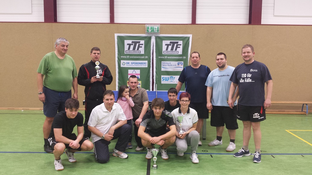 Sieger_Aktive u DoppelWir hoffen, dass es allen Beteiligten Spaß gemacht hat und wir zur nächsten Auflage des Eltern- und Sponsorenturniers im Sommer wieder so rege Beteiligung herrscht. Wir sprechen allen Siegern und Platzierten unseren herzlichsten Glückwunsch aus und hoffen, dass das Jahr 2014 für alle ein erfolgreiches wird, alle gesund bleiben und wir uns schon bald beim nächsten Event der TTF Weißwasser wiedersehen.