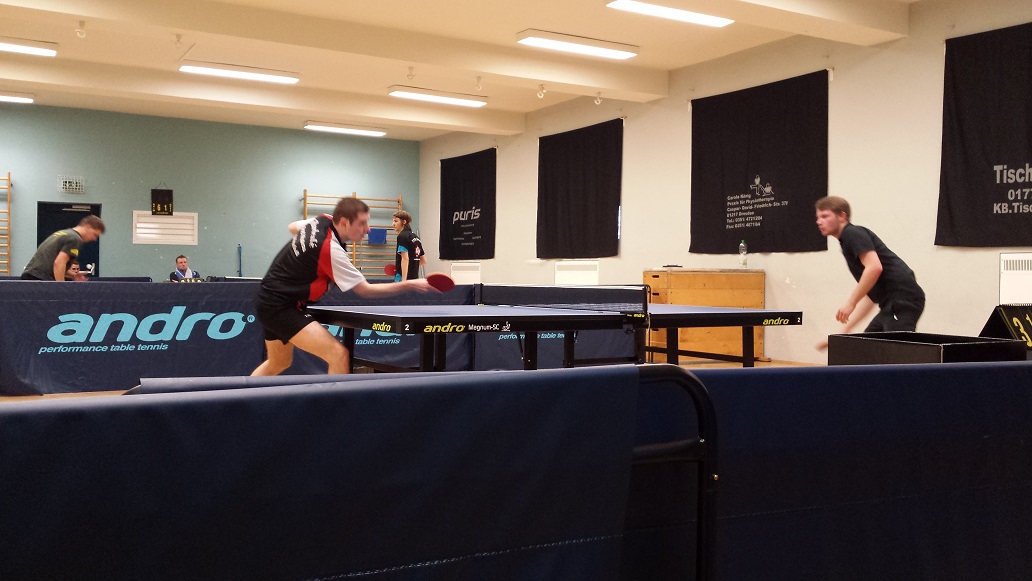 Los ging es um 11 Uhr gegen die Männer. Mit der Aufstellung David Jung (und nicht das hier irgendwelche Gerüchte entstehen. Das ist kein Fingerzeig für nächste Saison), Jan Beyer, Thomas Marschall und Steven Jung gingen die TTF in die Begegnung gegen eine starke Elbe Mannschaft, die allerdings „nur“ zu 50% aus Spielern der ersten Herren bestand. Der Start in die Doppel ging dann allerdings mit zwei 0:3 Niederlagen schon gehörig in die Hose. David und Jan konnten ein 10:7 im ersten Satz gegen Matze Bachmann und Niklas Pilsczek nicht durchbringen und auch Thomas und Steven waren gegen Tim Taubert und Christian Kietz nur im ersten Satz nah dran am Satzgewinn. Im Anschluss dann aber zwei zumindest kleine Fingerzeige der Weißwasseraner. Jan konnte Matze in den fünften Satz zwingen. Dort behielt Matze aber mit 11:9 die Oberhand und baute so den Vorsprung auf 3:0 aus. David erspielte sich gegen Tim eine 2:1 Satzführung. Diese reichte allerdings nicht um auch das Spiel für sich zu entscheiden und eine erneute Fünfsatzniederlage ließ den Vorsprung von Elbe auf 4:0 anwachsen. Steven hatte danach gegen Niklas nicht viel entgegenzusetzen und Unterlag mit 0:3. Den ersten Punkt für Weißwasser erspielte dann Thomas, der sich mit 3:1 gegen Christian durchsetzen konnte. Somit 1:5, aber immer noch alles drin. David kam dann aber gar nicht mit dem Spiel von Matze zurecht und unterlag mit 0:3. Das gleiche Bild dann beim Spiel von Jan gegen Tim, nur dieses Mal mit dem besseren Ende für Weißwasser. Somit 2:6. Im Anschluss gab es dann aber zwei 1:3 Niederlagen von Thomas gegen Niklas und Steven gegen Christian. Aber wir waren näher dran, als es das Ergebnis vermuten lässt.