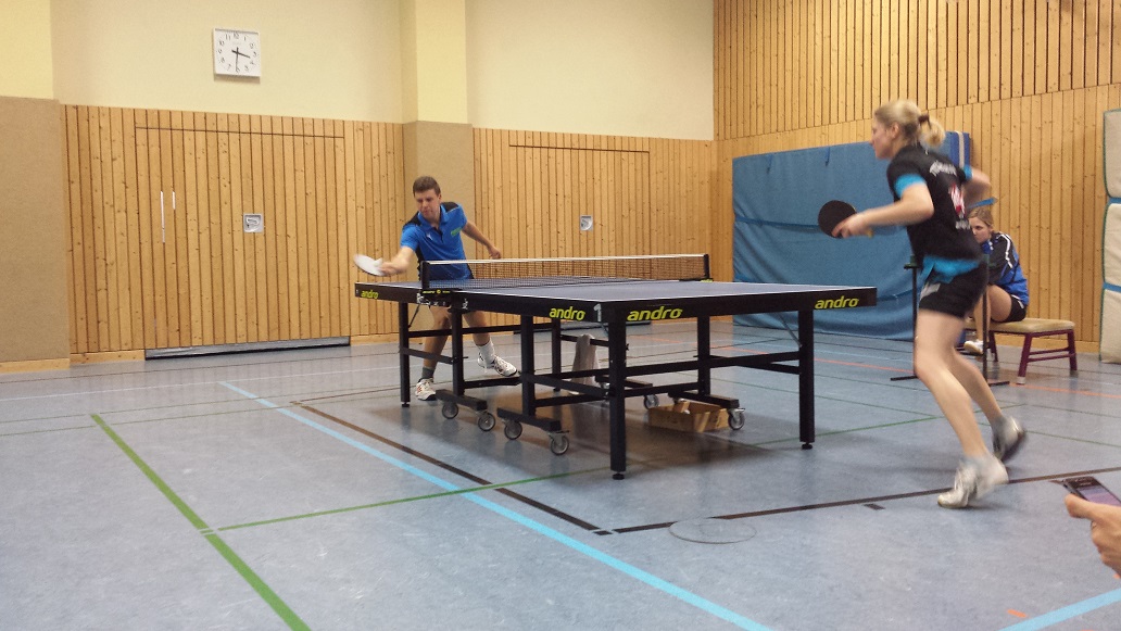 Am Nachmittag folgte dann das Spiel gegen die Damen, die in Bestbesetzung antraten. Zu Beginn der Doppel wurde uns dann auch schon gleich mal gezeigt, dass man die Damen auf keinen Fall unterschätzen sollte. Jan und Thomas lagen gegen Linda Streller und Helen Seifert aber mal ganz schnell mit 0:2 hinten. Glücklicherweise konnten sich beide steigern und das Spiel noch in ein 3:2 drehen. David und Steven ging es gegen Franziska Juckel und Christin Wasser zu Beginn auch nicht anders. 1:2 lag das Weißwasseraner Doppel hinten, konnte allerdings den Spieß auch nochmal umdrehen und so stand es nach den Doppeln, etwas unerwartet, 2:0 für Weißwasser. Die erste Einzelrunde lief dann für die Damen in etwa so wie es uns am Vormittag erging. Jan war zu sicher gegen Linda und setzte sich mit 3:1 durch. Franzi hatte gegen David durchaus die Chancen ihm das Leben schwerer zu machen als sie es letztlich tat und auch Christin hätte bei etwas ruhigerer Spielweise mit Sicherheit ein besseres Resultat gegen Thomas erzielen können. Den ersten Punkt für die Damen erspielte Helen, die sich mit ihrem sicheren Block- und Konterspiel gegen Steven durchsetzen konnte. 5:1 für Weißwasser war dann doch deutlicher als wir es erwartet hatten, es war aber auch ein sehr hartes Stück Arbeit. In den nächsten drei Einzeln konnten die TTF dann schon den Sack zumachen. Den Anfang machte David gegen Linda und mit einem 3:1 brachte er die TTF mit 6:1 in Führung. Jan dachte gegen Franzi wohl, dass das Spiel so weitergehen würde wie in den ersten beiden Sätzen. Doch weit gefehlt. Franzi setzte Jan mit zunehmender Spielzeit immer mehr unter Druck und punktete konstant mit rechts links Kombinationen und schon stand es 7:10 aus Jan´s Sicht im fünften Satz. Mit der nötigen Portion Glück konnte Jan den Rückstand wettmachen und sich letztlich mit 14:12 durchsetzen. Den Endstand stellte im Anschluss Thomas her. Gegen Helen ließ er sich im ersten Satz noch auf das Konterspiel ein und zog folgerichtig den Kürzeren. Durch Umstellung des Spiels konnte er sich aber die folgenden drei Sätze sichern und so hieß es am Ende 8:1 für Weißwasser.