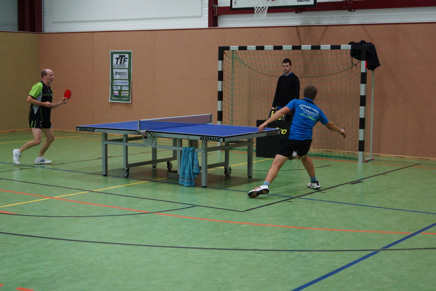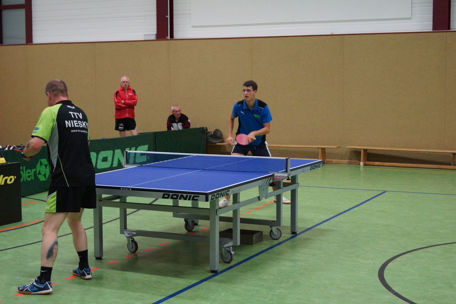 Da es sein Gesundheitszustand aber noch nicht zulässt vier Spiele zu bestreiten, blieb die Doppelaufstellung erstmal unverändert. Doppel 1 mit Beyer/Marschall machte gegen Vogt/Siebert auch gleich da weiter, wo man gegen Hoyerswerda aufgehört hatte. In den ersten zwei Sätzen hochkonzentriert, schlichen sich im dritten Satz dann doch einige Unkonzentriertheiten ein. Am Ende hieß es dennoch 3:0 und die TTF lagen mit 1:0 in Front. Doppel 2 mit Jung/Eggert hielt drei Sätze lang erstaunlich gut dagegen gegen Herrmann/Dieckmann, im vierten Satz hatte sich das Nieskyer Duo dann aber warm geschossen und konnte durch einen 3:1 Erfolg ausgleichen. Doppel 3 mit Stengel/Roßmeisl gelang es im Laufe des Spiels gegen Schmidt/Konschak taktisch hervorragend das Nieskyer Duo aus dem Spiel zu nehmen und der verdiente Lohn war ein nicht unbedingt erwarteter 3:0 Erfolg und die TTF führten nach den Doppeln mit 2:1.