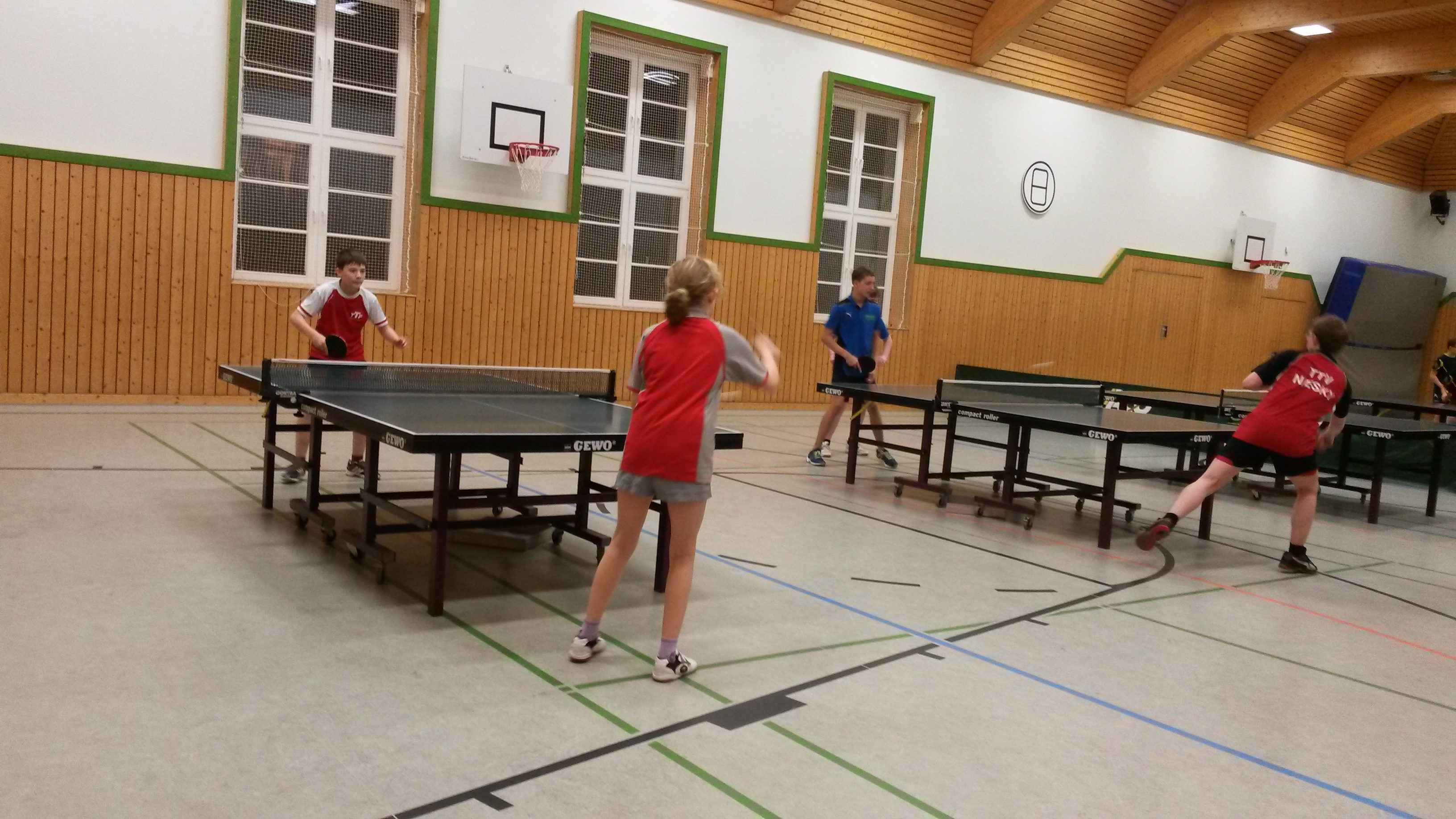 Bereits in der ersten Einzelrunde konnte man eine Führung erspielen und gab diese nicht mehr aus der Hand. Den Auftakt machte Camillo gegenVogt. Am Anfang hatte er noch so seine Schwierigkeiten, konnte sich dann jedoch kontinuierlich steigern und blieb ohne Satzverlust. Jonas wollte gegen Teichert gleich nachlegen und konnte den ersten Satz mit 11:9 für sich entscheiden. Jedoch fand Teichert dann immer besser in sein Spiel und bei Jonas schlichen sich immer wieder kleinere Fehler ein. Endstand 1:3 aus Sicht von Jonas. Zu meiner Überraschung zeigte Willi bei seinem ersten Auftritt keine Anzeichen von Nervosität und sicherte sich gleich den ersten Satz gegen Hoffmann. Die beiden folgenden Sätze gingen jedoch an die Gastgeberin. Willi war dennoch entschlossen und legte nochmal eine Schippe drauf und sicherte sich Satz vier und anschließend sogar den Entscheidungssatz. Nichts für schwache Nerven.