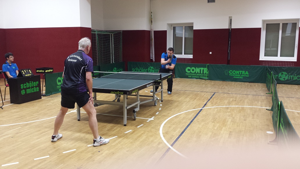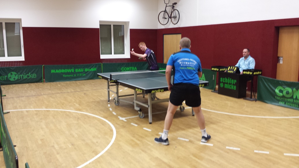 Dort angekommen wurde klar, dass es ein schwieriges Unterfangen wird die weiße Weste zu verteidigen, da auch die Doppel entsprechend umgestellt werden mussten. Aber ein kleines Ass im Ärmel haben die TTF ja noch wenn es hart auf hart kommt und genau dieses Ass sollte im Verlauf des Abends noch zur Trumpfkarte werden. Dass es in den Doppeln schwierig werden würde war klar und so hatten Jung/Worreschke gegen Minkwitz, Maik/Richter einen schweren Stand und mussten sich am Ende 0:3 geschlagen geben. Die alte/neue Kombination mit Marschall/Stengel löste ihre Aufgabe souverän und so lag es nun an Zilinsky/Eggert die TTF erstmals in Führung zu bringen. Leider scheiterte dieses Unterfangen im fünften Satz gegen Minkwitz/Minkwitz obwohl sich das TTF Duo nach 0:2 Satzrückstand nochmal in die Partie biss. So lag man also nach den Doppeln mit 1:2 zurück, ein Rückstand dem man den ganzen Abend hinterherlaufen sollte.