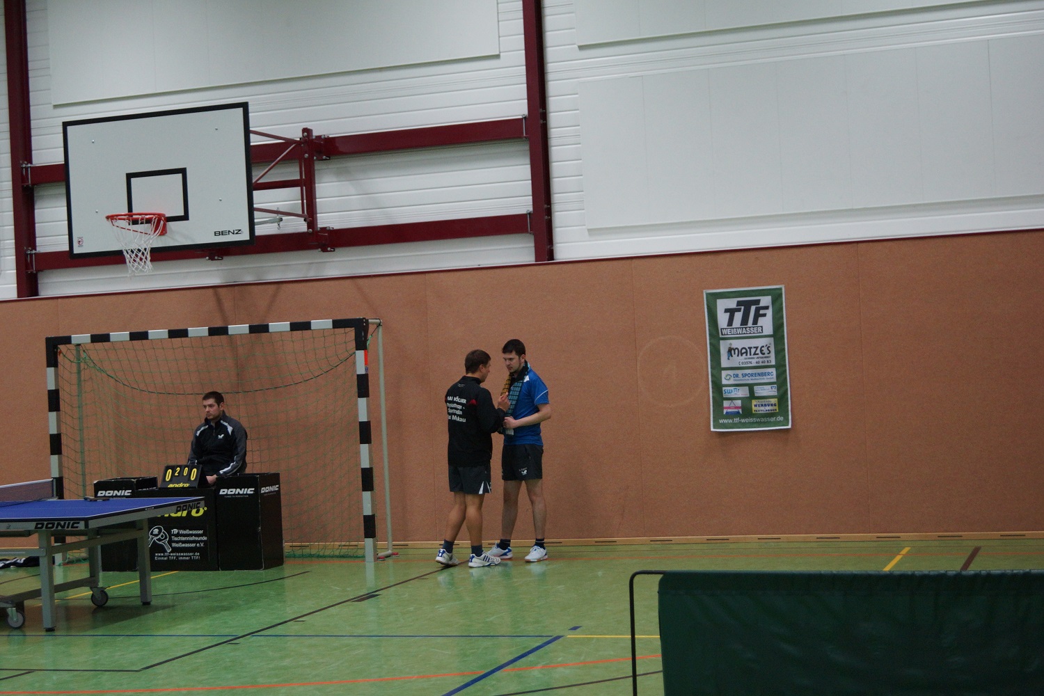 Hier bekam es zunächst Beyer mit Wiesner zu tun und es entwickelte sich ein Spiel, das ich nicht so recht beschreiben kann. Fünf enge Sätze, ein ständiges Auf und Ab und am Ende ein glücklicher Sieger Beyer, der damit einen wichtigen Punkt nach Weißwasser holte. Parallel versuchte Marschall sehr aggresiv Kramer schon bei dessen Aufschlag unter Druck zu setzen. Doch die Fehlerquote war einfach zu hoch, sodass es hier in drei Sätzen nichts zu holen gab. In der Mitte konnten die TTF dann den Rückstand aber drehen. Jung hatte im Duell der Linkshänder mit Schwarz fast immer die richtige Taktik parat und ließ eigentlich zu keinem Zeitpunkt Zweifel daran aufkommen, dass er dieses Spiel gewinnen würde. Letztlich tat er das auch souverän in drei Sätzen. Stengel und Pötschke lieferten sich indes ein Konterduell der alten Schule, welches Stengel am Ende knapp mit 3:1 für sich behaupten konnte. Im unteren Paarkreuz musste sich dann Zilinsky mit Gerke auseinander setzen. Letztlich verlor er die drei Sätze alle in der Verlängerung, wenn man sich aber mal die hohe Rate an Fehlern beim Rückschlag bzw. bei der Spieleröffnung vor Augen hält, muss man sich schon fragen ob diese Niederlage wirklich nötig war. Eggert musste zum Abschluss der ersten Einzelrunde gegen Abwehrass Noack ran und spielte zwei Sätze taktisch clever und der Lohn war eine 2:0 Satzführung. Im Anschluss stellte Noack sein Spiel etwas um, was scheinbar dazu führte, dass Eggert immer unruhiger wurde und seine Chancen zu unkonzentriert ausließ. Die Quittung war eine vermeidbare 2:3 Niederlagen, aus der der Weißwasseraner aber lernen wird und hoffentlich in Zukunft etwas konzentrierter zu Werke geht. Mit einem knappen Rückstand ging es also in die zweite Einzelrunde.